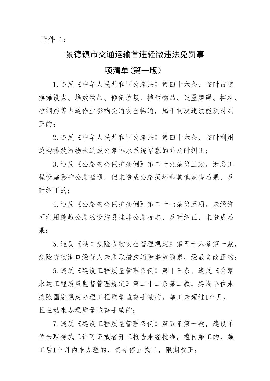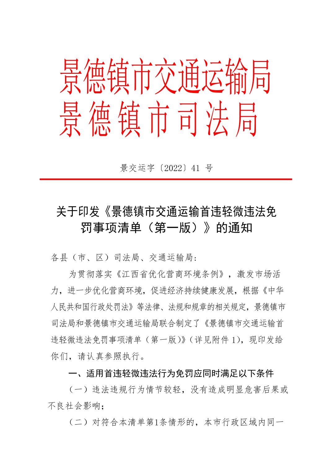 景交运字〔2022〕41号关于印发《景德镇市交通运输首违轻微违法免罚事项清单(第一版)》的通知(1).docx